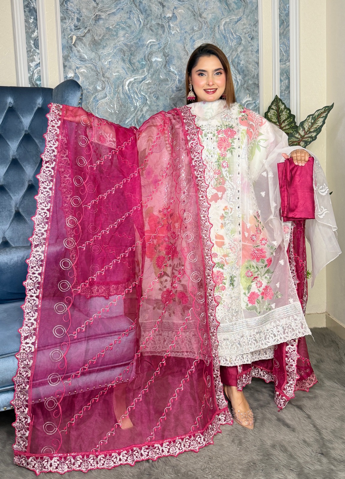 সাইজে বড়, দুপাট্টাজুড়ে গুটি গুটি মাল্টি সুতার জমাট বাঁধানো এমব্রোয়ডরি সিকুয়েন্স কাজ, ফ্রন্টে ড্রেসজুড়ে হেভি এমব্রোয়ডরি, মাল্টি সুতা সিকুয়েন্স কাজ ,ব্যাক সাইড কোন কাজ থাকবে না সলিড থাকবে, ডিজাইন এমব্রোয়ডরি ডিজাইন লুক দেখতে ক্যাটালগের মতো, সাইজ- সম্পূর্ণ শিলাই বিহীন ড্রেস বডি ৫৪, লং ৪৫